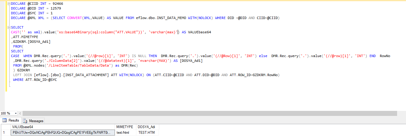 | Base64 veridir. Bu veri LineItemTable XML'inde yer alsada ben INST_DATA_ATTACHMENT tablosundan ilerlemenin daha saglıklı oldugunu düşünüyorum. | Dosyanın tipidir. Bu veri de INST_DATA_ATTACHMENT tablosunda yer almaktadır. | Oluşacak dosyanın ismidir. Burada "dosyaadı" da deseniz çalışacaktır. Veri bütünlüğünü korumak adına LineItemTable’da yer alan dosya ismi olması için ben sorguda lineitemtable XML’ini kullandım. |